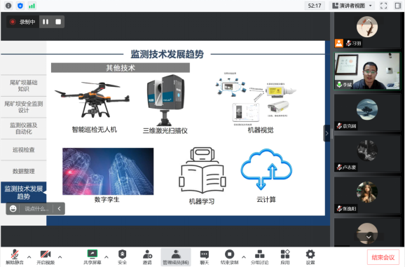 李斌博士深入浅出的讲解了尾矿坝安全监测设计内容;监测仪器及自动化,各种仪器的优缺点、应用场合及使用要求;巡视检查防范化解风险隐患及数据整理等方面的知识,让老师和同学们了解到目前在尾矿坝安全监测中工作中所应用的技术手段、仪器设备、分析方法等,各种方法的特点及优势。最后介绍了国内外尾矿坝安全监测技术的现状、不足之处及相关领域的发展态势。报告结束后,李斌博士和部分师生展开了讨论,并对同学们关注的一些问题进行了深入交流。